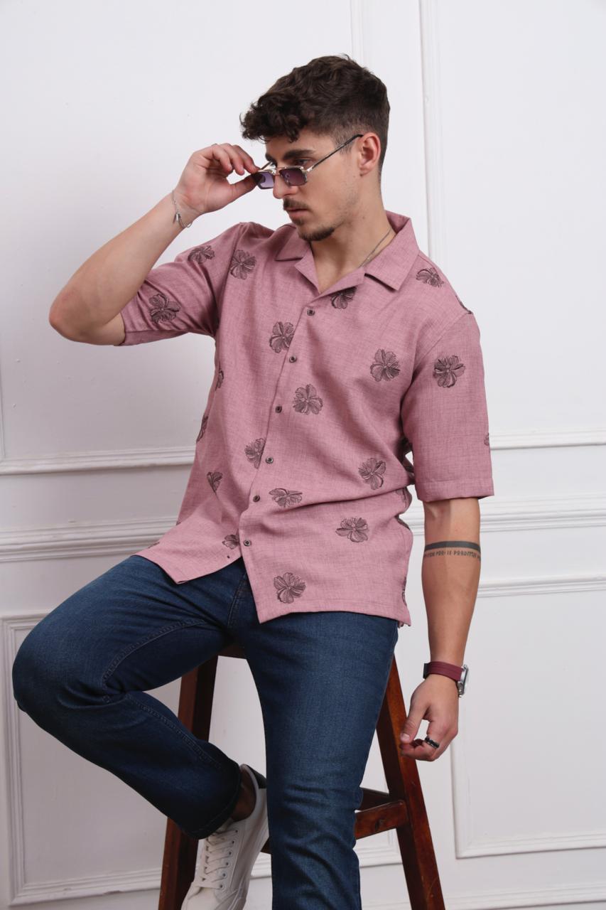 MAUVE COLOR WITH BLOOM FLOWERS CONTRAST MATCHING EMBROIDERY CUBAN COLLAR SHIRT
